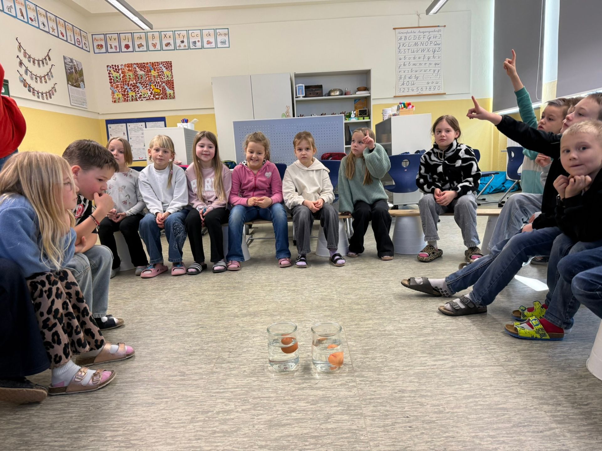 Ein besonderes Highlight war der sogenannte Schwimmtest. Die Kinder konnten dabei selbst herausfinden, wie alt ein Ei ist. Mit großen Augen beobachteten sie, ob die Eier auf den Boden sanken oder an der Oberfläche schwammen. Frau Dölker erklärte geduldig, dass frische Eier sinken, während ältere Eier oben schwimmen.